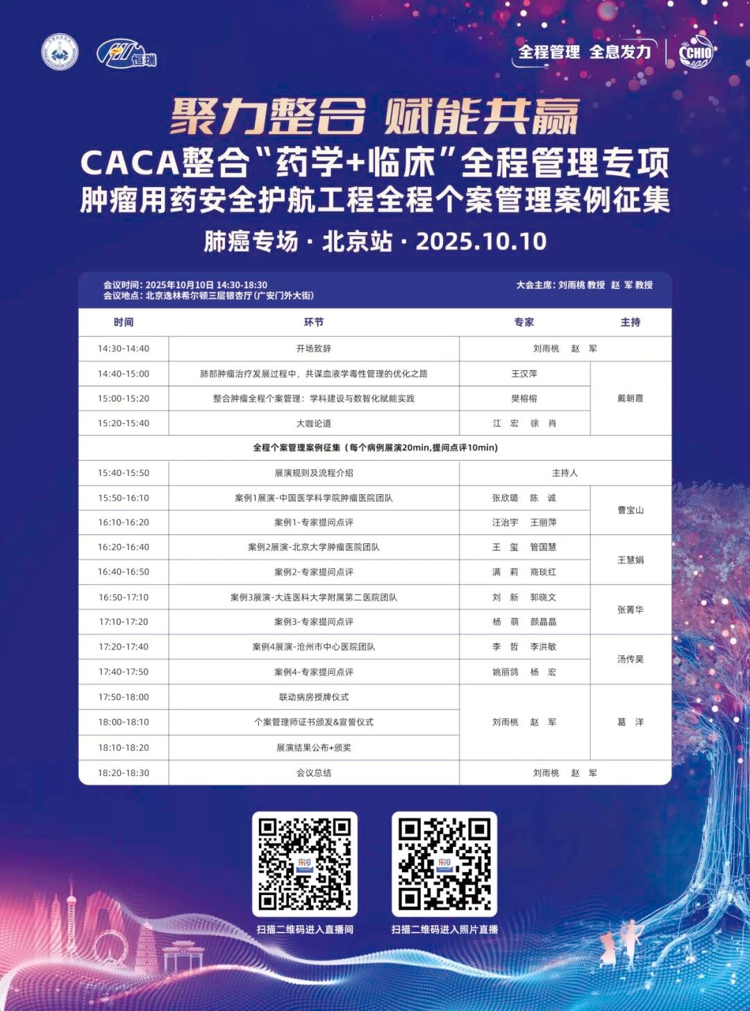 因此,中国抗癌协会个案管理专业委员会推出 CACA整合“药学+临床”全程管理专项 肿瘤用药安全护航工程全程个案管理案例征集 线下会议,计划于2025年10月10日在北京举办。