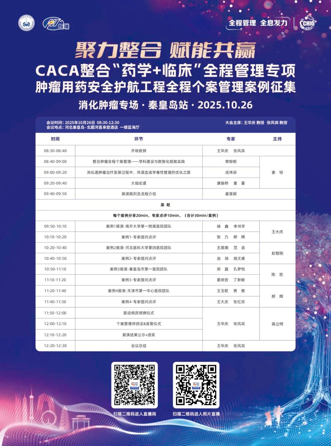 因此,中国抗癌协会个案管理专业委员会推出 CACA整合“药学+临床”全程管理专项 肿瘤用药安全护航工程全程个案管理案例征集 线下会议,计划于2025年10月26日在秦皇岛举办。