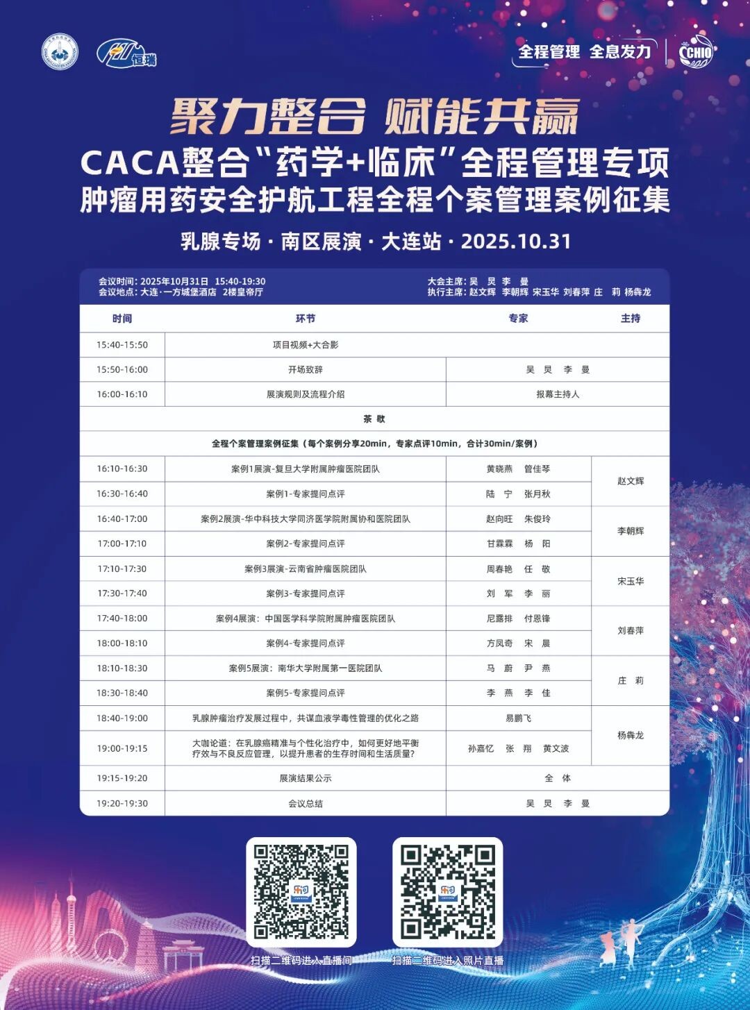 因此,中国抗癌协会个案管理专业委员会推出 CACA整合“药学+临床”全程管理专项 肿瘤用药安全护航工程全程个案管理案例征集 线下会议,计划于2025年10月31日在大连举办。