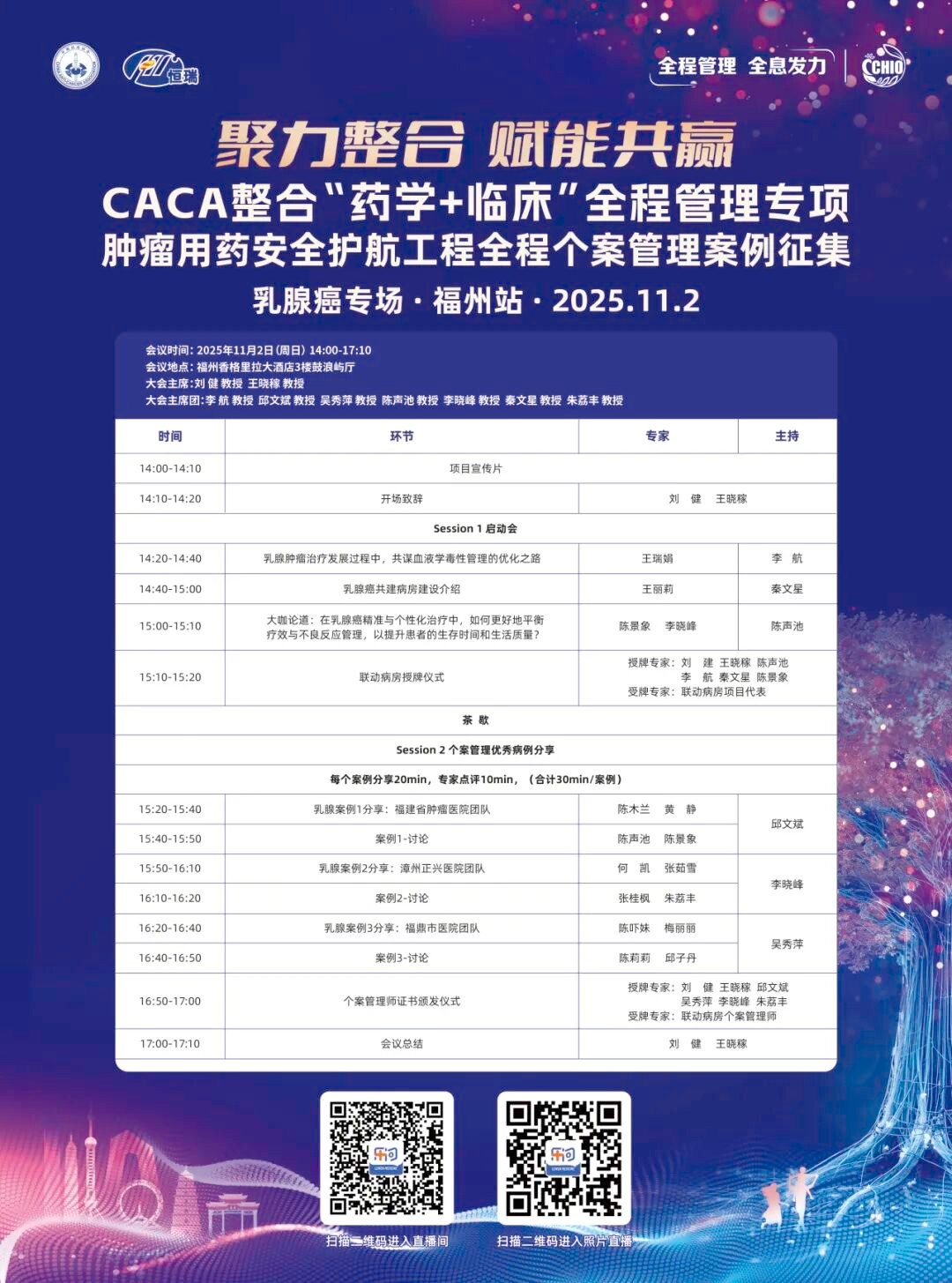 因此,中国抗癌协会个案管理专业委员会推出 CACA整合“药学+临床”全程管理专项 肿瘤用药安全护航工程全程个案管理案例征集 线下会议,计划于2025年11月2日在福州举办。