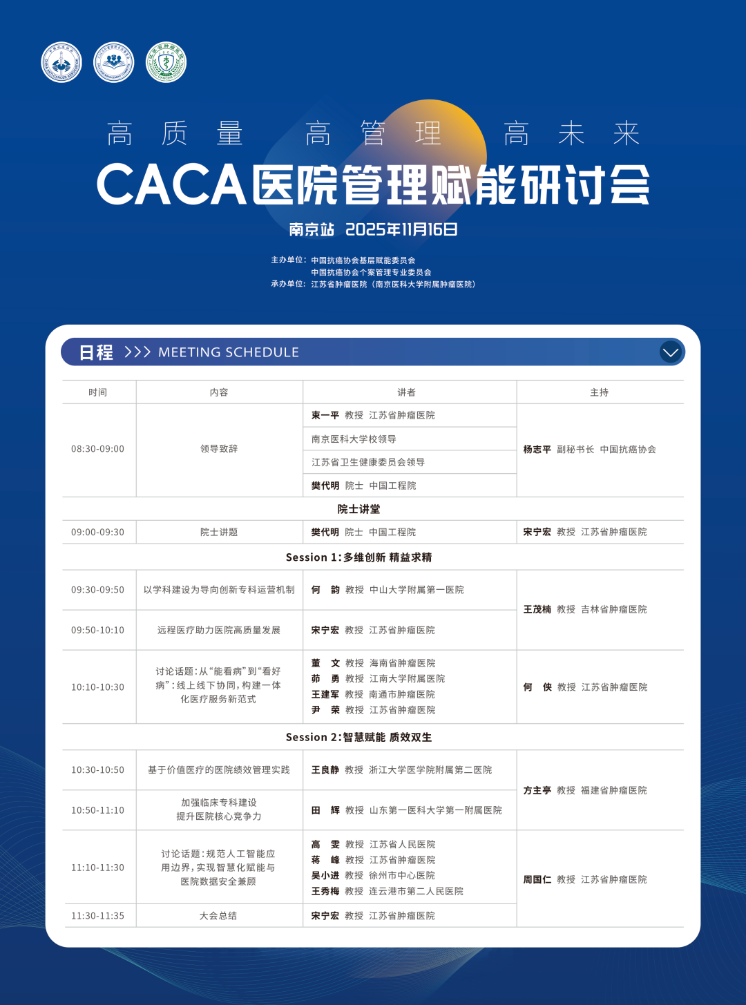 为聚焦医院学科建设体系化突破、推动管理精细化提质、深化智慧化赋能创新,进一步提升我国医院综合管理水平,保障各级医疗机构发展协同并进,由中国抗癌协会基层赋能委员会、中国抗癌协会个案管理专业委员会主办,江苏省肿瘤医院承办的“高质量·高管理·高未来:CACA医院管理赋能研讨会”将于11月16日在江苏南京隆重召开!