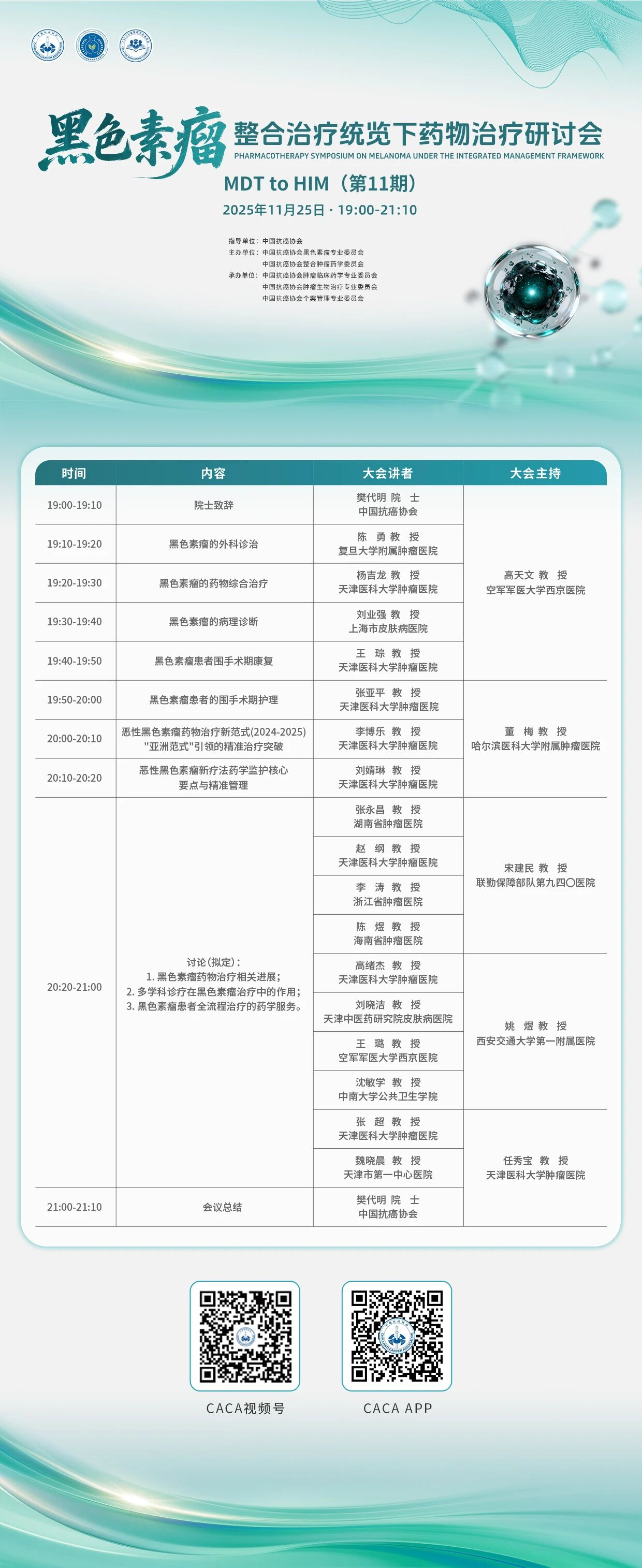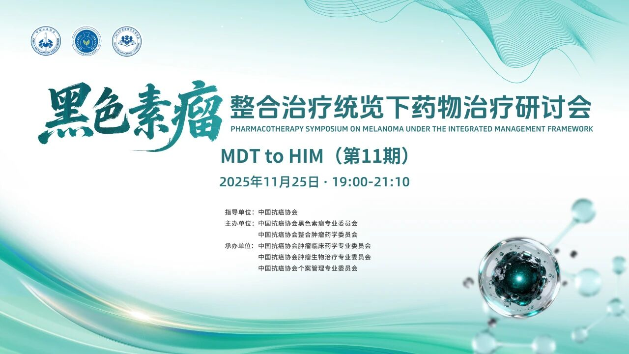 为促进黑色素瘤整合治疗领域学术交流,由中国抗癌协会指导,中国抗癌协会黑色素瘤专业委员会、中国抗癌协会整合肿瘤药学委员会主办,中国抗癌协会肿瘤临床药学专业委员会、中国抗癌协会肿瘤生物治疗专业委员会、中国抗癌协会个案管理专业委员会承办的“MDT to HIM(第11期):黑色素瘤整合治疗统览下药物治疗研讨会”将于2025年11月25日(周二)19:00—21:10线上召开。