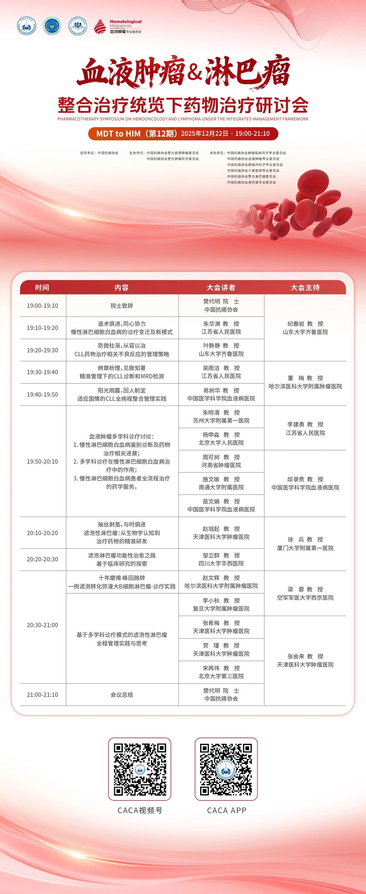 为促进血液肿瘤&淋巴瘤整合治疗领域学术交流,由中国抗癌协会指导,中国抗癌协会整合血液肿瘤委员会、中国抗癌协会整合肿瘤药学委员会主办,中国抗癌协会肿瘤临床药学专业委员会、中国抗癌协会血液肿瘤专业委员会、中国抗癌协会肿瘤内科学专业委员会、中国抗癌协会个案管理专业委员会、中国抗癌协会整合淋巴瘤委员会、中国抗癌协会淋巴瘤专业委员会承办的“MDT to HIM(第12期):血液肿瘤&淋巴瘤整合治疗统览下药物治疗研讨会”将于2025年12月22日(周一)19:00—21:10线上召开,本次会议也是“MDT to HIM”系列研讨会2025年度的收官之作。