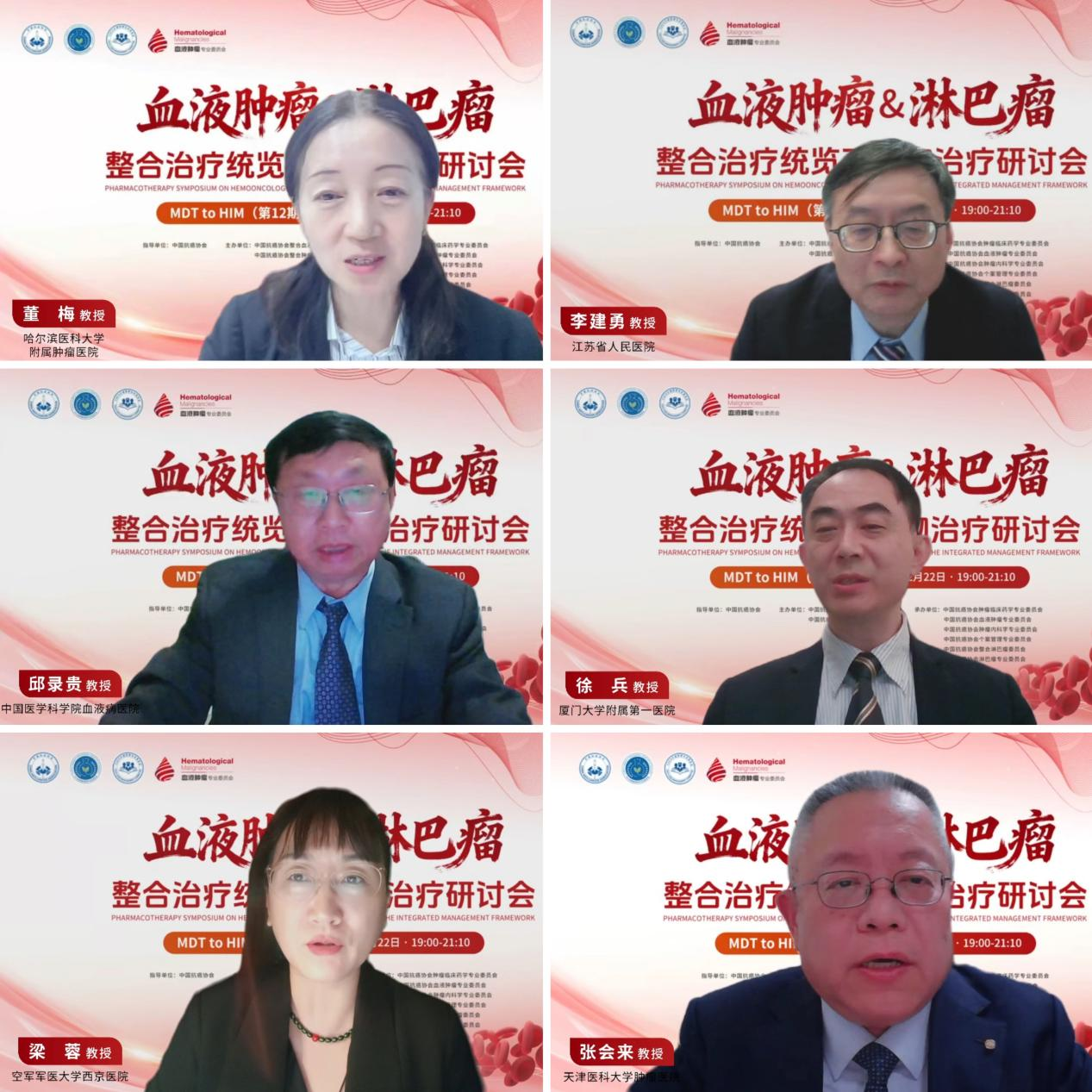 专题研讨分别由中国抗癌协会整合肿瘤药学委员会执行主任、哈尔滨医科大学附属肿瘤医院董梅教授,中国抗癌协会整合血液肿瘤委员会副主任、江苏省人民医院李建勇教授,中国抗癌协会整合血液肿瘤委员会副主任、中国医学科学院血液病医院邱录贵教授,中国抗癌协会血液肿瘤专委会副主委、厦门大学附属第一医院徐兵教授,中国抗癌协会淋巴瘤整合康复专委会主委、空军军医大学西京医院梁蓉教授,中国抗癌协会淋巴瘤专委会主委、天津医科大学肿瘤医院张会来教授主持。