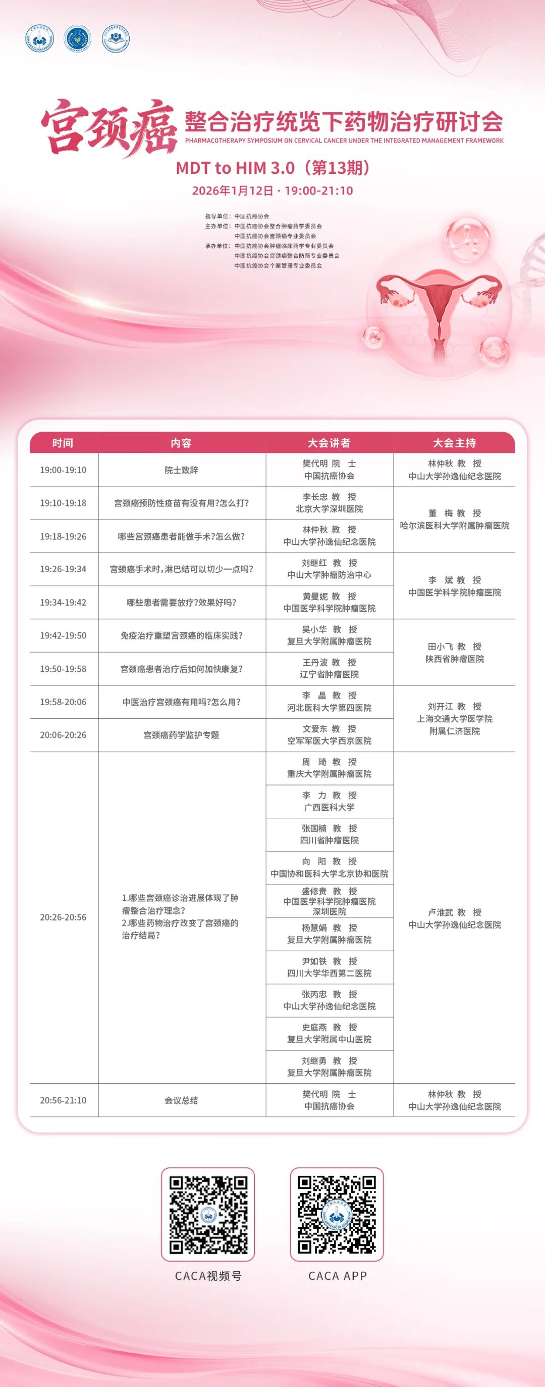 为促进宫颈癌整合治疗领域学术交流,规范基层医生临床用药路径与诊疗思维,推动临床实践向规范化与创新化发展,由中国抗癌协会指导,中国抗癌协会整合肿瘤药学委员会、中国抗癌协会宫颈癌专业委员会主办,中国抗癌协会肿瘤临床药学专业委员会、中国抗癌协会宫颈癌整合防筛专业委员会、中国抗癌协会个案管理专业委员会承办的“MDT to HIM(第13期):宫颈癌整合治疗统览下药物治疗研讨会”将于2026年1月12日(周一)19:00—21:10线上召开,本次会议也是“MDT to HIM”系列研讨会2026年度的首场学术活动。