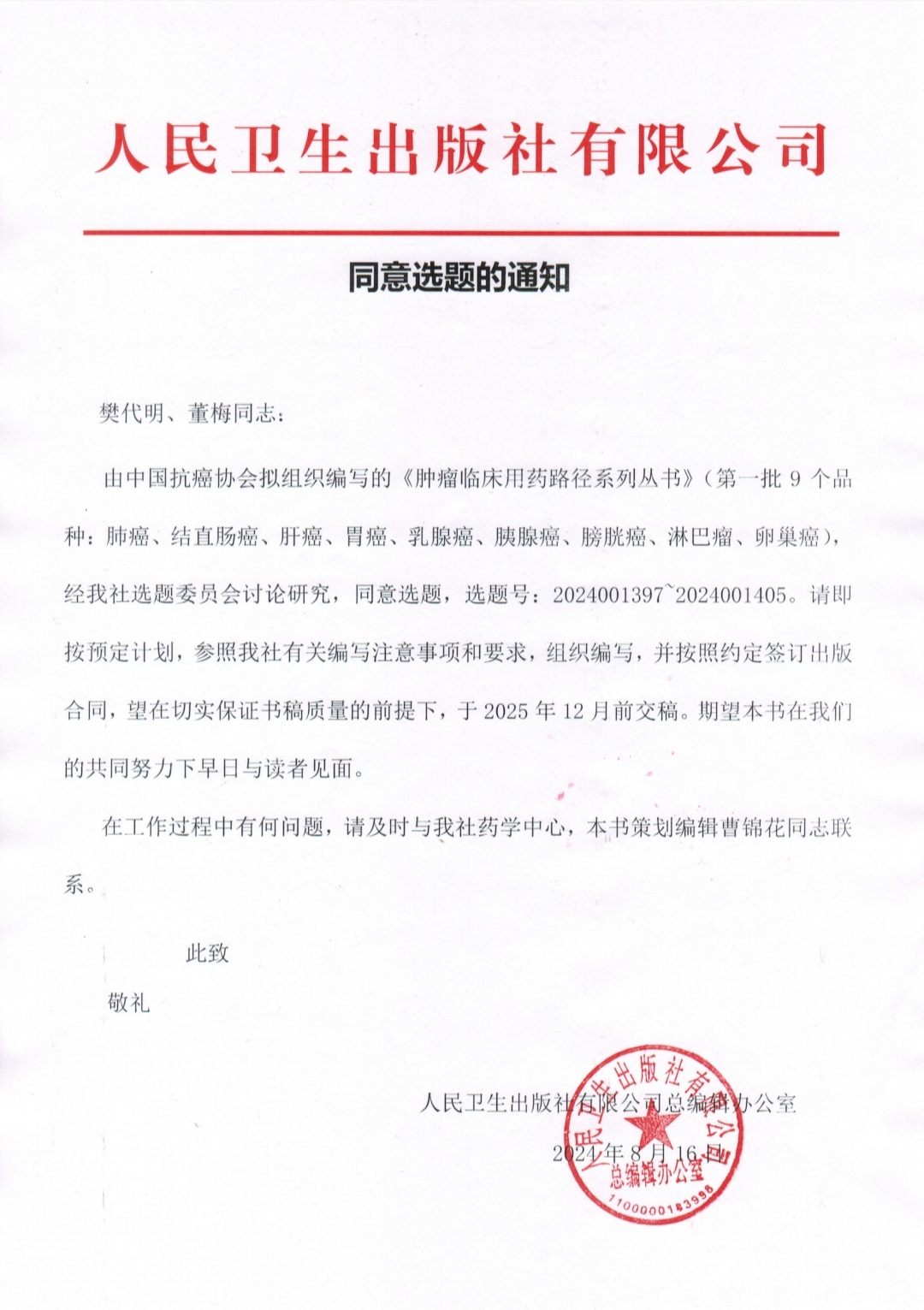 《肿瘤临床用药路径系列从书》(第一批:肺癌、结直肠癌、肝癌、胃癌、乳腺癌、胰腺癌、膀胱癌、淋巴瘤、卵巢癌)已获得人民卫生出版社同意立项。该套丛书的编写将为各类瘤种的用药路径提供权威指导,为推动肿瘤药物治疗的规范化和系统化奠定坚实基础。