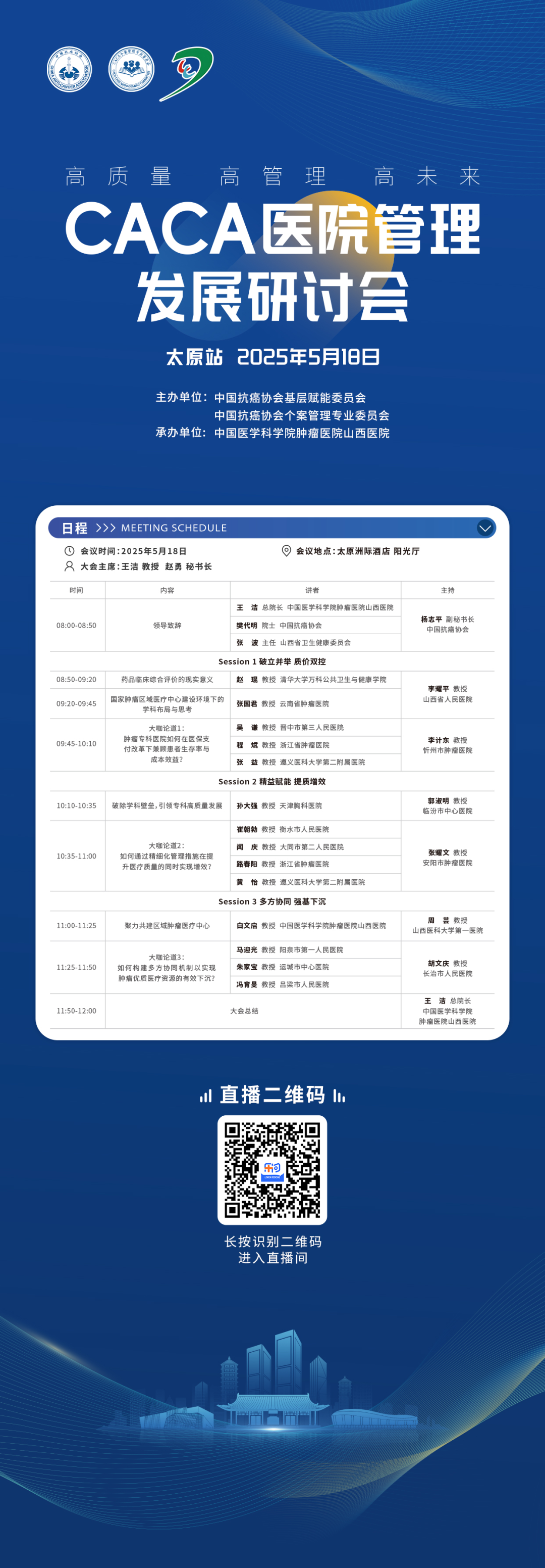 为进一步推动我国医院管理水平提升,培育高素质医疗管理人才,增强医院核心竞争力,由中国抗癌协会指导,中国抗癌协会基层赋能委员会、中国抗癌协会个案管理专业委员会主办,中国医学科学院肿瘤医院山西医院承办的“高质量·高管理·高未来:CACA医院管理发展研讨会”将于5月18日在山西太原隆重召开!