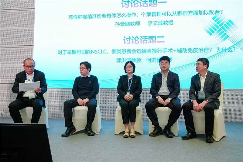天津医科大学肿瘤医院孙蕾娜教授、中国医学科学院肿瘤医院李文斌教授、郭洪波教授、宁夏医科大学总医院何进喜教授针对“恶性肿瘤的精准诊断应该如何操作,个案管理可以从哪些方面加以配合”“对于早期可切除非小细胞肺癌,哪类患者可以选择行手术+辅助免疫治疗”展开激烈讨论。本环节由尤健教授主持。
