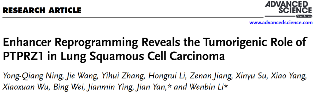 2025年9月3日, 中国医学科学院肿瘤医院李文斌教授团队与西安交通大学第一附属医院/香港城市大学严健教授团队 合作,在 Advanced Science 期刊上发表了题为 《Enhancer Reprogramming Reveals the Tumorigenic Role of PTPRZ1 in Lung Squamous Cell Carcinoma》 的研究论文。