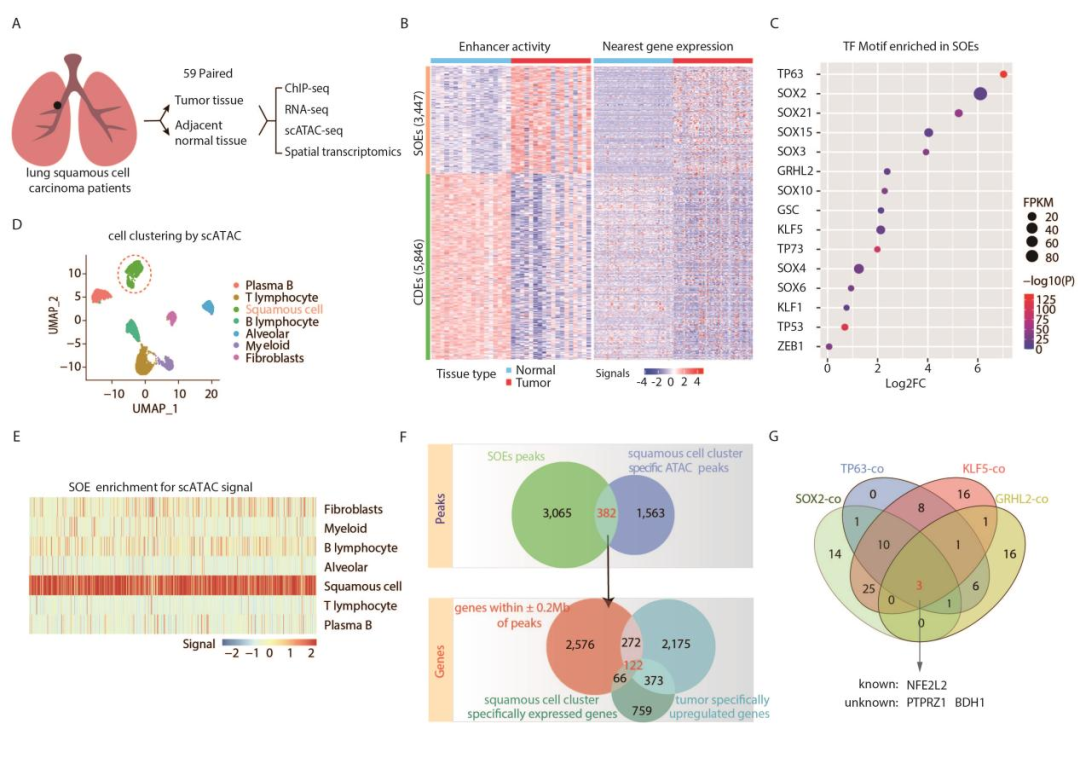 该研究对配对肺鳞癌样品进行表观遗传分析,通过ChIP-seq技术系统性鉴定了LSCC中3,447个肿瘤特异性增强子(SOE),并发现这些SOE富集了SOX2、p63、KLF5和GRHL2等关键转录因子的结合位点。随后单细胞ATAC-seq分析显示,SOE仅在鳞状细胞中高度开放,且这些转录因子在肿瘤细胞中特异性表达。通过整合bulk与单细胞RNA-seq数据,研究筛选出122个与SOE邻近、特异性高表达且与上述四个转录因子共表达的基因,包括 NFE2L2(NRF2) 、 PTPRZ1 等基因。