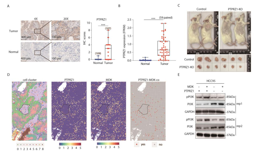 进一步发现,受体型酪氨酸磷酸酶PTPRZ1作为一个由SOE驱动的新型癌基因,在LSCC组织中显著高表达。功能实验证实,敲低PTPRZ1可显著抑制肿瘤细胞增殖和体内成瘤能力。空间转录组分析进一步发现,Midkine(MDK)是PTPRZ1的关键配体,MDK-PTPRZ1信号轴通过激活PI3K磷酸化促进肿瘤生长。