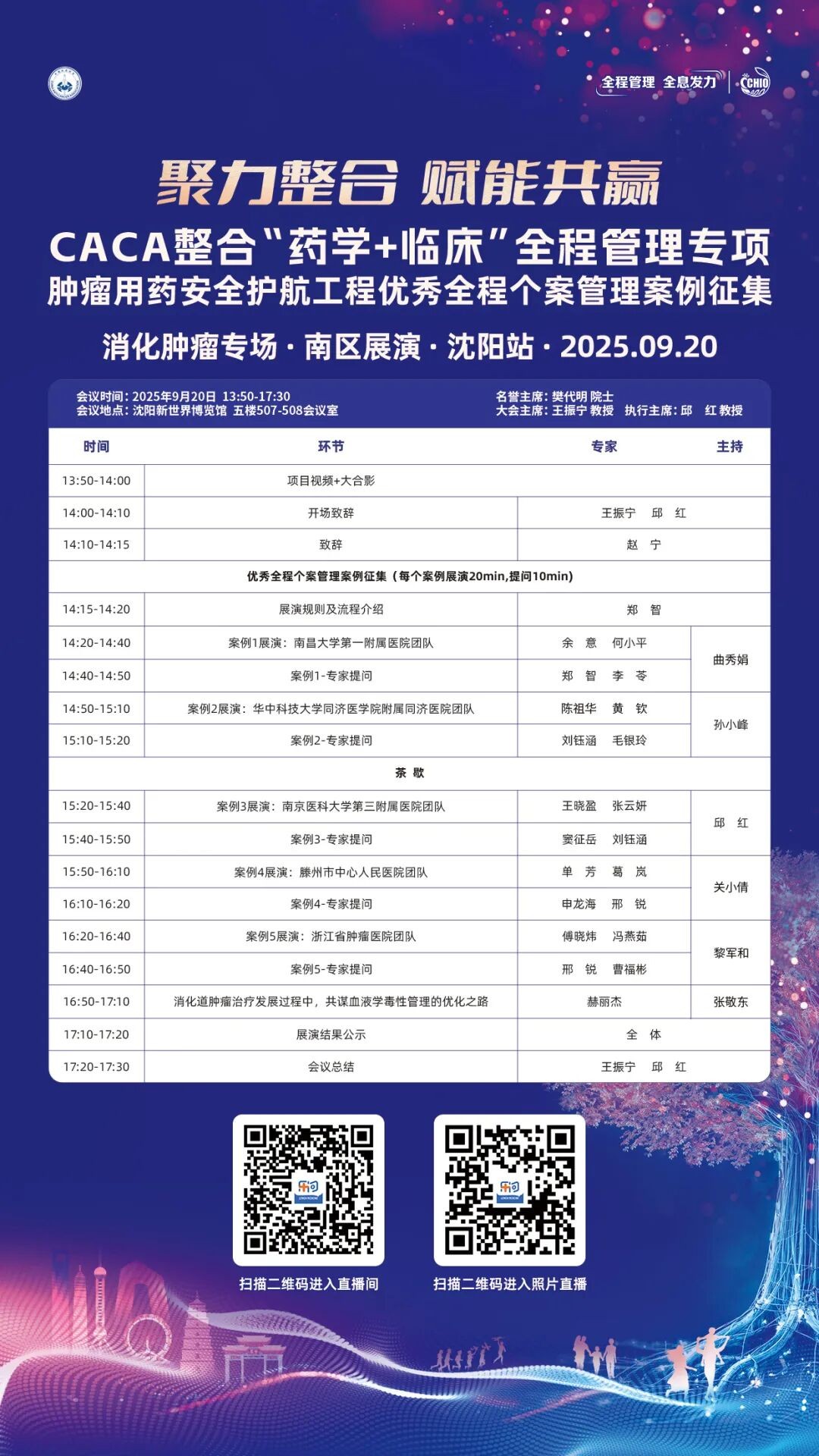 因此,中国抗癌协会个案管理专业委员会推出 CACA整合“药学+临床”全程管理专项 肿瘤用药安全护航工程优秀全程个案管理案例征集 线下会议,计划于2025年9月20日在沈阳举办。